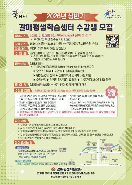 [NWS¹æ¼Û=Çѽ¸ñ ±âÀÚ]±¸¸®½Ã´Â ±¸¸®½ÃÆò»ýÇнÀ°ü, °¥¸ÅÆò»ýÇнÀ¼¾ÅÍ, ¼öÅÃÆò»ýÇнÀ¼¾ÅÍ¿¡¼ ¿î¿µÇÏ´Â 2026³â »ó¹Ý±â Æò»ýÇнÀ °ÁÂÀÇ ¼ö°»ýÀ» ¿À´Â 2¿ù 9ÀϺÎÅÍ ¸ðÁýÇÑ´Ù°í ¹àÇû´Ù.