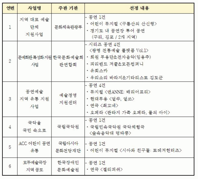 À̹ø¿¡ ¼±Á¤µÈ »ç¾÷Àº ¡ãÁö¿ª ´ëÇ¥¿¹¼ú´Üü Áö¿ø »ç¾÷(¹®ÈüÀ°°ü±¤ºÎ) ¡ã¹®¿¹È¸°ü Ư¼ºÈ Áö¿ø »ç¾÷(Çѱ¹¹®È¿¹¼úȸ°ü¿¬ÇÕȸ) ¡ã°ø¿¬¿¹¼ú Áö¿ª À¯Åë Áö¿ø »ç¾÷(¿¹¼ú°æ¿µÁö¿ø¼¾ÅÍ) ¡ãÁö¿ª ¹®ÈÇâÀ¯±âȸ È®´ë¸¦ À§ÇÑ '±¹¾ÇÀ» ±¹¹Î ¼ÓÀ¸·Î'(±¹¸³±¹¾Ç¿ø) ¡ãACC ¾î¸°ÀÌ °ø¿¬ À¯Åë(±¹¸³¾Æ½Ã¾Æ¹®ÈÀü´çÀç´Ü) ¡ã¸ðµÎ¿¹¼ú±ØÀå Áö¿ª °ø¿¬ °ø¸ð(Çѱ¹Àå¾ÖÀι®È¿¹¼ú¿ø)ÀÌ´Ù.