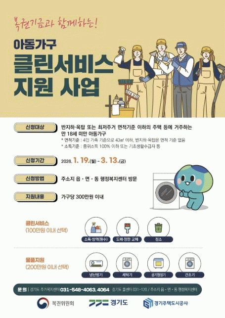 À̹ø »ç¾÷Àº ÁÖ°Åȯ°æ °³¼±À» À§ÇÑ Å¬¸°¼ºñ½º¿Í »ýȰ Çʼö ¹°Ç° Áö¿øÀ¸·Î ±¸¼ºµÈ´Ù. Ŭ¸°¼ºñ½º´Â ¼Òµ¶¡¤¹æ¿ªÀ» Çʼö·Î Á¦°øÇϸç, µµ¹è¡¤ÀåÆÇ ±³Ã¼, û¼Ò, ¼ö³³ Á¤¸® Áß¿¡¼ 2°³ Ç׸ñÀ» ¼±ÅÃÇØ Áö¿ø¹ÞÀ» ¼ö ÀÖ´Ù. ¶ÇÇÑ ³Ã³¹æ±â, ¼¼Å¹±â, °ø±âûÁ¤±â, °ÇÁ¶±â µî »ýȰ°¡Àü °¡¿îµ¥ ¿øÇÏ´Â 2°³ ǰ¸ñÀ» Á¦°ø¹ÞÀ» ¼ö ÀÖ´Ù.