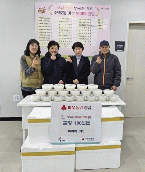 [NWS¹æ¼Û=Çѽ¸ñ ±âÀÚ]±¸¸®½Ã ¼öÅÃ2µ¿ ÇàÁ¤º¹Áö¼¾ÅÍ´Â Áö³­ 2¿ù 9ÀÏ, Áö¿ª À½½ÄÁ¡ ¶Ò¹Ù¸®·ÎºÎÅÍ ¼³ ¸íÀýÀ» ¸Â¾Æ ¼³··ÅÁ 100ÀκÐÀ» ÈÄ¿ø¹Þ¾Æ °ü³» Àú¼Òµæ Ãë¾à°èÃþ¿¡ Àü´ÞÇß´Ù°í ¹àÇû´Ù.