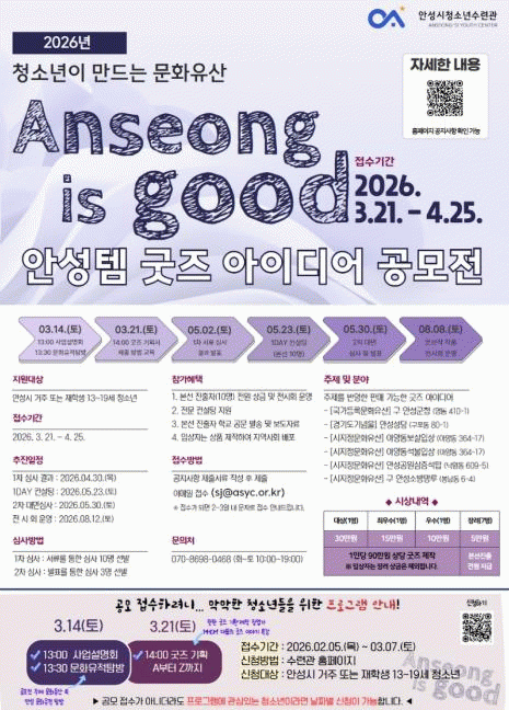 | ¾È¼º½Ãû¼Ò³â¼ö·Ã°ü, 2026 ¾È¼ºÅÛ ±ÂÁî ¾ÆÀ̵ð¾î °ø¸ðÀü °³ÃÖ ¾È¼ºÀÇ ¹®ÈÀ¯»ê, û¼Ò³âÀÇ °¨°¢À¸·Î Àçź»ý... 3¿ù 21ÀϺÎÅÍ Á¢¼ö ½ÃÀÛ =Çѽ¸ñ ±âÀÚ |