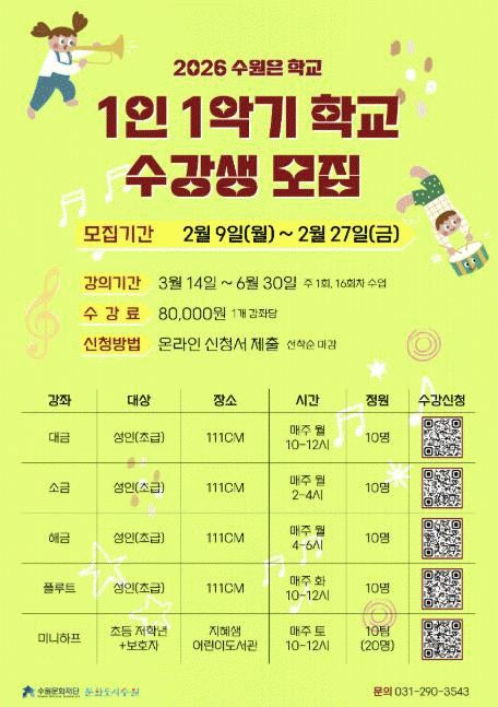 | ¼ö¿ø¹®ÈÀç´Ü, À½¾ÇÀÌ ÀÖ´Â ÀÏ»ó '1ÀÎ 1¾Ç±â Çб³' ¼ö°»ý ¸ðÁý 2¿ù 27ÀϱîÁö ¼±Âø¼ø Á¢¼ö... ÃÊ±Þ °úÁ¤ 5°³ °ÁÂ, ¾Ç±â ´ë¿© Áö¿ø =Çѽ¸ñ ±âÀÚ |