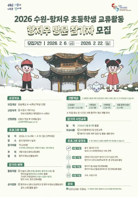 | ¼ö¿øÆ¯·Ê½Ã, '2026 ¼ö¿ø-Ç×Àú¿ì ÃʵîÇлý »óÈ£¹æ¹®±³·ù' Âü°¡ÀÚ ¸ðÁý ÃʵîÇб³ 4~6Çгâ 10¸í ¼±¹ß¡¦±¹Á¦±³·ù·Î ±Û·Î¹ú ¿ª·® Ű¿î´Ù =Çѽ¸ñ ±âÀÚ |