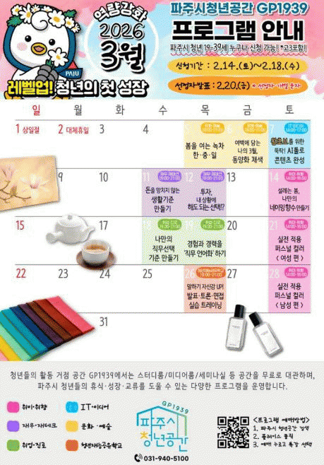 3¿ù ÇÁ·Î±×·¥Àº ¡®·¹º§ ¾÷! û³âÀÇ Ã¹ ¼ºÀ塯À» ÁÖÁ¦·Î, û³âµéÀÌ ÀÏ»ó ¼Ó °ü½É»çºÎÅÍ ¡ãÃë¾÷¡¤Áø·Î ¡ãÀ繫¡¤Àç»ê°ü¸® ¡ãÃë¹Ì¡¤ÃëÇ⠡㹮ȡ¤¿¹¼ú ¡ãµðÁöÅÐ ¿ª·®±îÁö Æø³Ð°Ô °æÇèÇÏ¸ç ½ÇÁúÀûÀÎ º¯È¿Í ¼ºÀåÀ» ü°¨ÇÒ ¼ö ÀÖµµ·Ï ±âȹµÆ´Ù.