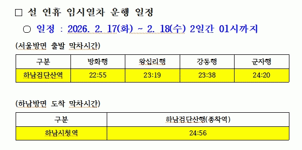 ¿¬Àå ¿îÇàÀº ¼³ ´çÀϰú ±×´ÙÀ½ ³¯ÀÎ 17ÀÏ, 18ÀÏ¿¡ ÁýÁßÀûÀ¸·Î ÀÌ·ç¾îÁø´Ù. ¼­¿ï¹æ¸é »óÇà ¿­Â÷´Â Çϳ²°Ë´Ü»ê¿ª Ãâ¹ß ±âÁØ, ±âÁ¸ ¿ÀÈÄ 11½Ã 40ºÐÀ̾ú´ø ¸·Â÷ ½Ã°£ÀÌ »õº® 12½Ã 20ºÐÀ¸·Î 40ºÐ ´ÊÃçÁø´Ù.