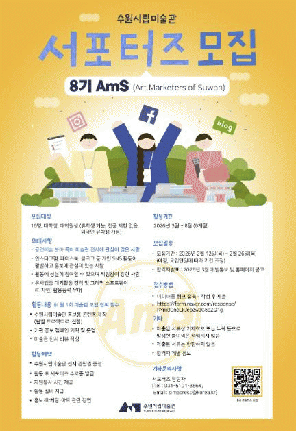 ¼ö¿ø½Ã¸³¹Ì¼ú°ü ´ëÇлý ¼Æ÷ÅÍÁî´Â Áö³ 2019³âºÎÅÍ ¿î¿µÇØ Áö±Ý±îÁö ÃÑ 112¸íÀÇ ´ëÇлýÀÌ AmS·Î Ȱµ¿ÇÏ¸ç ¹Ì¼ú°ü ¿Â¶óÀÎ È«º¸¿ë ÄÜÅÙÃ÷ Á¦ÀÛ ¹× ¹®È ÇÁ·Î±×·¥ ¿î¿µ Áö¿ø µî ´Ù¾çÇÑ È°µ¿À» ÆîÃÆ´Ù.