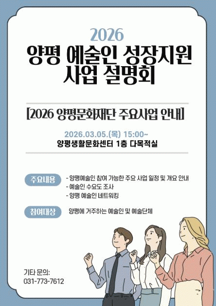 ù°, 2026³â ÁøÇà ¿¹Á¤ÀÎ °ø¸ð Áö¿ø»ç¾÷ °èȹÀ» °øÀ¯ÇÑ´Ù. ¾çÆò¹®ÈÀç´ÜÀÇ ÁÖ¿ä »ç¾÷ÀÎ ¡®¸ðµç¿¹¼ú31¡¯, ¡®¹°¸¼Àº ¾î¿ï¸² À½¾Çȸ¡¯, ¡®»ýȰ¹®ÈÁö¿ø»ç¾÷¡¯Àº ¹°·Ð ¿ÜºÎ ±â°üÀÇ °ø¸ð»ç¾÷ Á¤º¸µµ ÇÔ²² Á¦°øµÉ ¿¹Á¤ÀÌ´Ù.