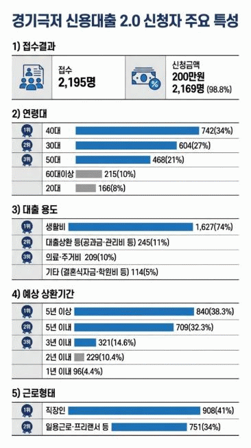 ¡®°æ±â ±ØÀú½Å¿ë´ëÃâ 2.0¡¯Àº 19¼¼ ÀÌ»ó ½Å¿ëÆòÁ¡ ÇÏÀ§ 10% °æ±âµµ¹ÎÀ» ´ë»óÀ¸·Î ÃÖ´ë 200¸¸ ¿ø ÇѵµÀÇ ¼Ò¾× ´ëÃâÀ» Áö¿øÇÑ´Ù. µµ´Â ¿ÃÇØ »ç¾÷À» 2.0À¸·Î °³¼±Çϸ鼭 »óȯ ±â°£À» ±âÁ¸ 5³â¿¡¼­ ÃÖÀå 10³âÀ¸·Î È®´ëÇØ »óȯ ºÎ´ãÀ» ¿ÏÈ­Çϰí, ´ëÃâ ½ÇÇà Àü »ó´ãÀ» Àǹ«È­Çϰí, ±ÝÀ¶?°í¿ë?º¹Áö ¿¬°è¸¦ ÅëÇÑ »çÀü?»çÈÄ ÅëÇÕ °ü¸® ü°è¸¦ µµÀÔÇß´Ù.