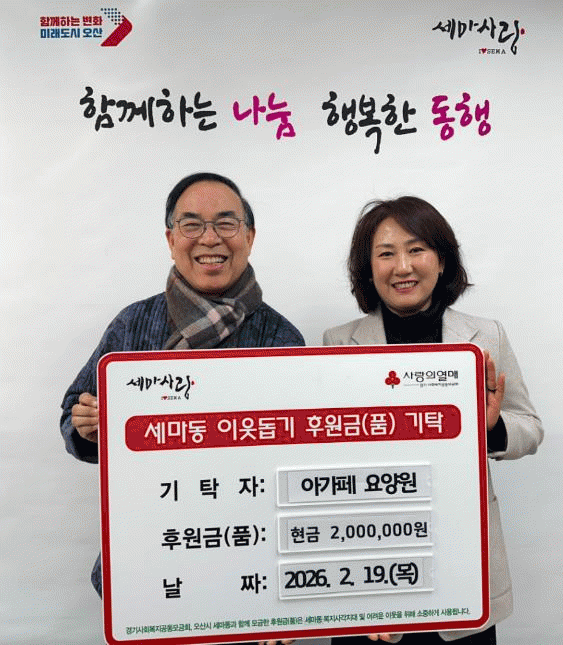 | ¿À»ê½Ã ¼¼¸¶µ¿ ÇàÁ¤º¹Áö¼¾ÅÍ, ¾Æ°¡Æä ¿ä¾ç¿øÀ¸·ÎºÎÅÍ Ãë¾à°èÃþ Áö¿ø ¼º±Ý 200¸¸¿ø ±âŹ¹Þ¾Æ =Çѽ¸ñ ±âÀÚ |