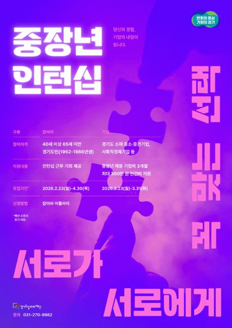 [NWS¹æ¼Û=Çѽ¸ñ ±âÀÚ]°æ±âµµ¿Í °æ±âµµÀÏÀÚ¸®Àç´ÜÀº µµ³» ÁßÀå³â ±¸Á÷ÀÚ¿¡°Ô ÀÏ °æÇèÀ» Á¦°øÇϰí, ±â¾÷¿¡´Â ÀΰǺñ¸¦ Áö¿øÇÏ´Â ¡®ÁßÀå³â ÀÎÅÏ½Ê »ç¾÷¡¯ Âü¿©ÀÚ¿Í ±â¾÷À» 23ÀϺÎÅÍ ¸ðÁýÇÑ´Ù. ¿ÃÇØ´Â ÃÑ 730¸íÀÇ ÁßÀå³â µµ¹ÎÀÌ »ç¾÷¿¡ Âü¿©ÇÒ ¼ö ÀÖ´Ù.