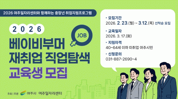 ¸ðÁý ±â°£Àº 2¿ù 23ÀϺÎÅÍ 3¿ù 12ÀϱîÁöÀ̸ç, ¿©Áֽÿ¡ °ÅÁÖÇÏ´Â 40¼¼ºÎÅÍ 64¼¼ ÀÌÇÏÀÇ ¹ÌÃë¾÷ÀÚ 15¸íÀ» ¼±Âø¼ø ¸ðÁýÇÏ°í ±³À° ½ÅûÀº ¿©ÁÖÀÏÀÚ¸®¼¾Å͸¦ ¹æ¹®ÇÏ¸é µÈ´Ù.