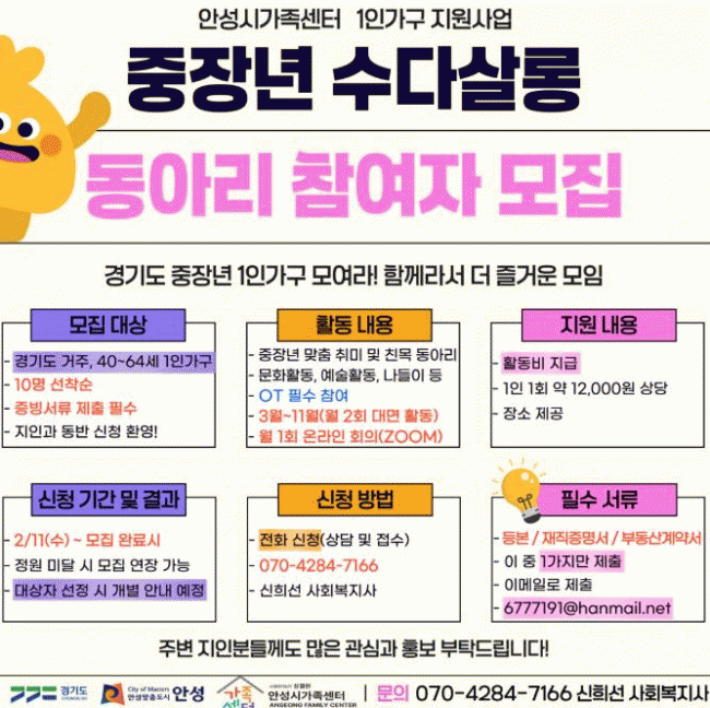 | ¾È¼º½Ã °¡Á·¼¾ÅÍ, 1ÀÎ °¡±¸ ´ë»ó 'ÁßÀå³â ¼ö´Ù»ì·Õ' Âü¿©ÀÚ ¸ðÁý =Çѽ¸ñ ±âÀÚ |