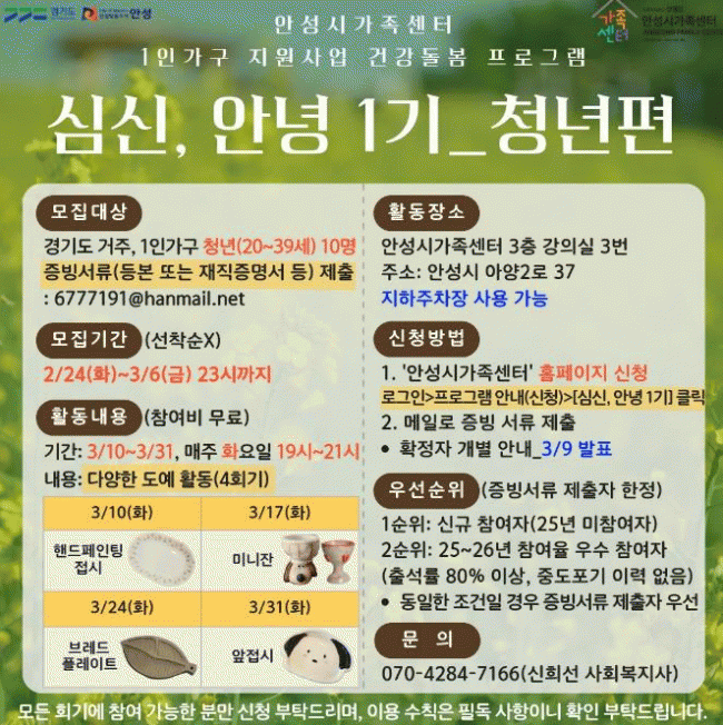 ¾È¼º½Ã °¡Á·¼¾ÅÍ, 1ÀÎ °¡±¸ Áö¿ø»ç¾÷ °Ç°­µ¹º½ ÇÁ·Î±×·¥ '½É½Å, ¾È³ç 1±â' û³â Âü¿©ÀÚ ¸ðÁý