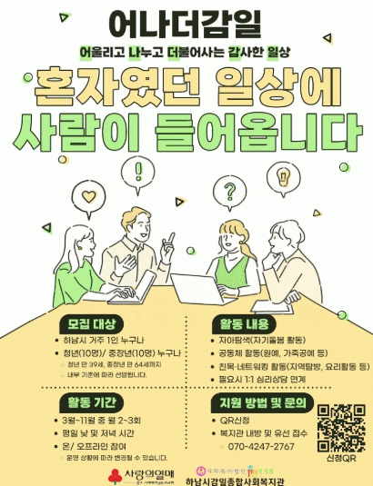 [NWS¹æ¼Û=Çѽ¸ñ ±âÀÚ]Çϳ²½Ã°¨ÀÏÁ¾ÇÕ»çȸº¹Áö°ü(»çȸº¹Áö¹ýÀÎ ÈÞ¸Õº¹Áöȸ ¿î¿µ)Àº 2026³â 1¿ùºÎÅÍ 12¿ù±îÁö 1ÀÎ °¡±¸ÀÇ »çȸÀû °ü°è¸Á Çü¼º°ú Áö¿ª»çȸ Âü¿© È®´ë¸¦ À§ÇÑ Æ¯È»ç¾÷ '¾î³ª´õ °¨ÀÏ(¾î¿ï¸®°í ³ª´©°í ´õºÒ¾î»ç´Â °¨»çÇÑ ÀÏ»ó)'À» ¿î¿µÇϸç ÀÌ¿¡ Âü¿©ÇÒ ´ë»óÀÚ¸¦ ¸ðÁýÇÑ´Ù.