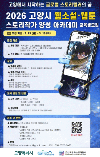[NWS¹æ¼Û=ÇãÀº¼­ ±âÀÚ]°í¾ç»ê¾÷ÁøÈï¿øÀÌ À¥ÄÜÅÙÃ÷ »ê¾÷À» À̲ø¾î°¥ ½ºÅ丮 Àü¹® ÀÎÀç ¹ß±¼À» À§ÇÑ ¡®2026 °í¾ç½Ã À¥¼Ò¼³¡¤À¥Å÷ ½ºÅ丮ÀÛ°¡ ¾ç¼º ¾ÆÄ«µ¥¹Ì¡¯ ±³À°»ýÀ» ¸ðÁýÇÑ´Ù.