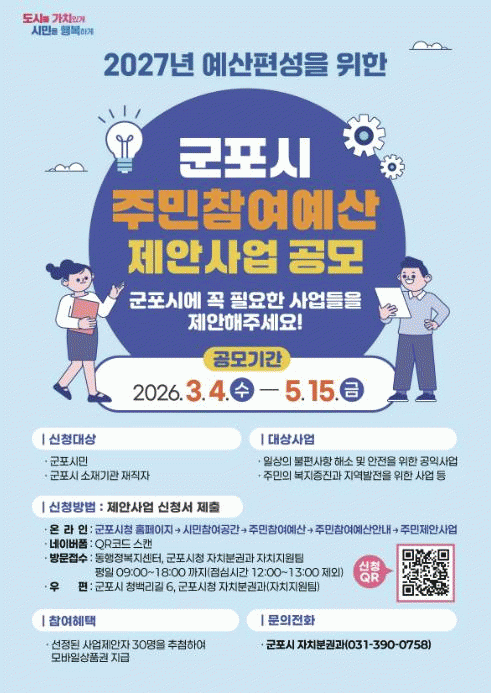 [NWS¹æ¼Û=Çѽ¸ñ ±âÀÚ]±ºÆ÷½Ã´Â 3¿ù 4ÀϺÎÅÍ 5¿ù 15ÀϱîÁö ¡®2027³â ¿¹»êÆí¼ºÀ» À§ÇÑ ÁÖ¹ÎÂü¿©¿¹»ê Á¦¾È»ç¾÷¡¯À» °ø¸ðÇÑ´Ù.