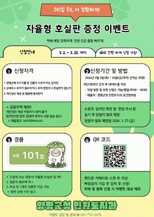 [NWS¹æ¼Û=Çѽ¸ñ ±âÀÚ]¾çÆò±ºÀº ´Ù°¡±¸¡¤´Ù¼¼´ëÁÖÅà µî¿¡¼ »ó¼¼ÁÖ¼Ò(µ¿¡¤Ãþ¡¤È£)°¡ ÇöÀå¿¡¼ È®ÀεÇÁö ¾Ê¾Æ ¹ß»ýÇÏ´Â ºÒÆíÀ» ÇØ¼ÒÇϰí, ÀÀ±Þ»óȲ ¹ß»ý ½Ã ½Å¼ÓÇÑ À§Ä¡ È®ÀÎÀ» Áö¿øÇϱâ À§ÇØ »ó¼¼ÁÖ¼ÒÆÇ ¼³Ä¡ »ç¾÷À» ÃßÁøÇÑ´Ù°í ¹àÇû´Ù.