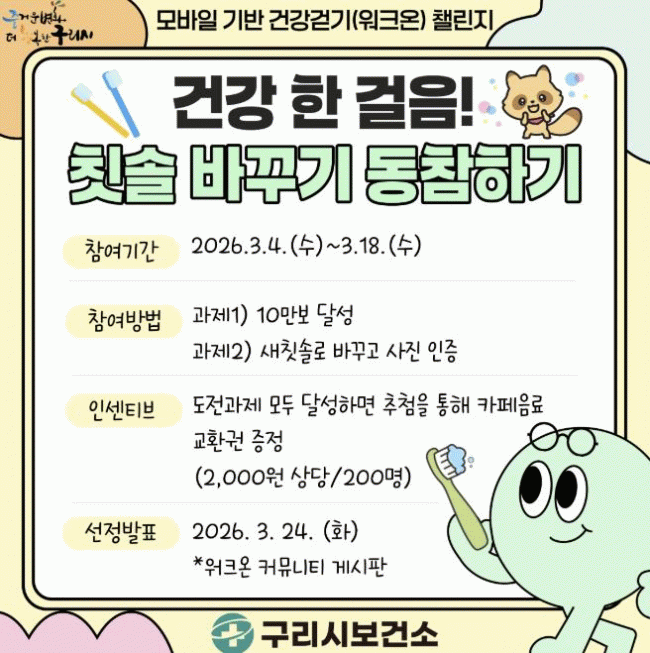 [NWS¹æ¼Û=Çѽ¸ñ ±âÀÚ]±¸¸®½Ã´Â 3¿ù 4ÀϺÎÅÍ 3¿ù 18ÀϱîÁö 15Àϰ£ ½Ã¹ÎÀÇ ±¸°­°Ç°­ ÁõÁøÀ» À§ÇØ ¡®°Ç°­ ÇÑ °ÉÀ½! Ä©¼Ö ¹Ù²Ù±â µ¿ÂüÇØ¿ä¡¯ Âü¿© Àձ⸦ ¿î¿µÇÑ´Ù°í ¹àÇû´Ù.