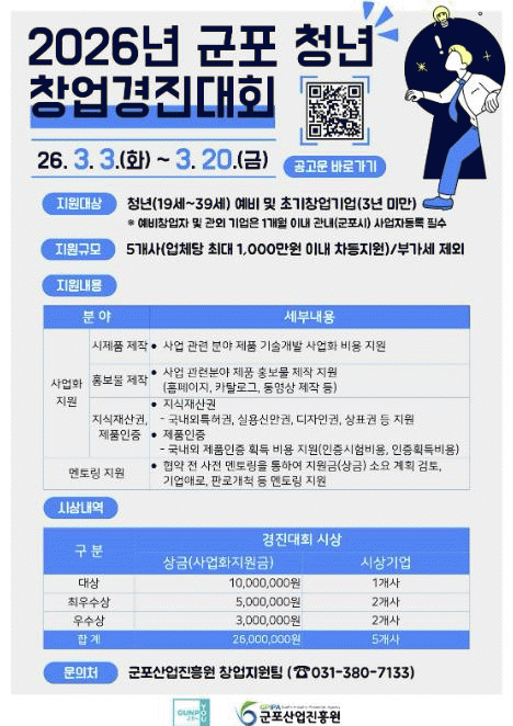 [NWS¹æ¼Û=Çѽ¸ñ ±âÀÚ]±ºÆ÷»ê¾÷ÁøÈï¿øÀº Áö¿ª ³» À¯¸Á û³â â¾÷°¡¸¦ ¹ß±¼Çϰí Çõ½Å ¾ÆÀ̵ð¾îÀÇ ¼º°øÀûÀÎ »ç¾÷ȸ¦ Áö¿øÇϱâ À§ÇØ 2026³â ±ºÆ÷ û³â â¾÷°æÁø´ëȸ Áö¿ø»ç¾÷ Âü°¡ÀÚ¸¦ 2026³â 3¿ù 3ÀϺÎÅÍ 3¿ù 20ÀϱîÁö ¸ðÁýÇÑ´Ù°í ¹àÇû´Ù.