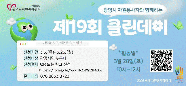 Ŭ¸°µ¥ÀÌ´Â ÀÚ¿øºÀ»ç ´Üü.Ȱµ¿Ã³¸¦ ºñ·ÔÇÏ¿© ±¤¸í½Ã¹ÎÀÌ¸é ´©±¸³ª Âü¿©ÇÒ ¼ö ÀÖÀ¸¸ç, ±¤¸í½ÃÀÚ¿øºÀ»ç¼¾ÅÍ È¨ÆäÀÌÁö ¶Ç´Â Æ÷½ºÅÍ ³» QRÄڵ带 ÅëÇØ »çÀü ½ÅûÇÏ¸é µÈ´Ù. Ȱµ¿ ÈÄ »çÁø°ú ¹æ¸í·ÏÀ» ¼¾ÅÍ·Î Á¦ÃâÇϸé 1365ÀÚ¿øºÀ»çÆ÷ÅÐÀ» ÅëÇØ ºÀ»çȰµ¿ ½Ã°£ÀÌ ÀÎÁõµÈ´Ù.