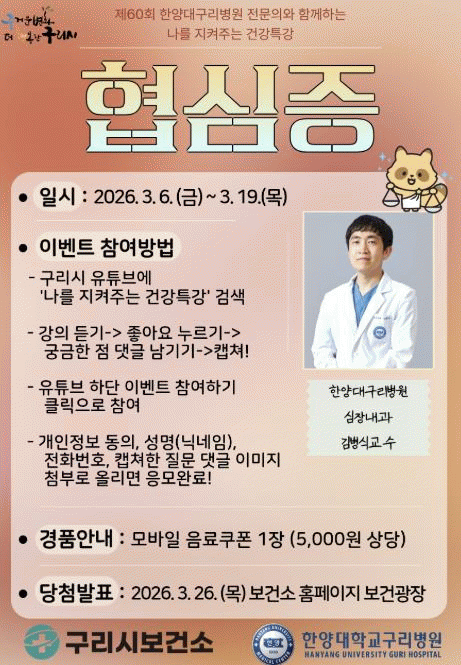 | ±¸¸®½Ã, À¯Æ©ºê ±¸¸®ºñÀü¿¡¼ ¸¸³ª´Â °Ç°Æ¯° 'Çù½ÉÁõ'À¸·Î ½Ã¹Î°ú ¼ÒÅë °¡½¿ ÅëÁõÀ¸·Î ¾Ë¾Æº¸´Â ½ÉÀå °Ç°, Çù½ÉÁõÀÇ ÀÌÇØ¿Í ¿¹¹æ =Çѽ¸ñ ±âÀÚ |