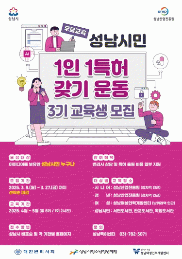 | ¼º³²»ê¾÷ÁøÈï¿ø, '¼º³²½Ã¹Î 1ÀÎ 1ƯÇã °®±â ¿îµ¿' 3±â ±³À°»ý ¸ðÁý ƯÇãºÎÅÍ »óÇ¥¡¤µðÀÚÀαîÁö Áö½ÄÀç»ê ±³À° È®´ë¡¦ ½Ã¹Î ¾ÆÀ̵ð¾î ±Ç¸®È Áö¿ø =Çѽ¸ñ ±âÀÚ |