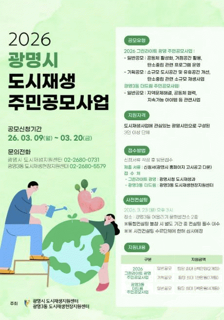 ¡®±¤¸í3µ¿ ´õµå¸² Áֹΰø¸ð»ç¾÷¡¯Àº ±¤¸í3µ¿ µµ½ÃÀç»ý Ȱ¼ºÈÁö¿ªÀÇ ¸¶À» ¹®Á¦ ÇØ°á°ú °øµ¿Ã¼ Çù·Â ÇÁ·Î±×·¥ µîÀ» ÁÖÁ¦·Î °ø¸ð¸¦ ÁøÇàÇÑ´Ù. 4ÆÀÀ» ¼±Á¤ÇÏ¸ç ÆÀ´ç ÃÖ´ë 500¸¸ ¿øÀ» Áö¿øÇÑ´Ù.