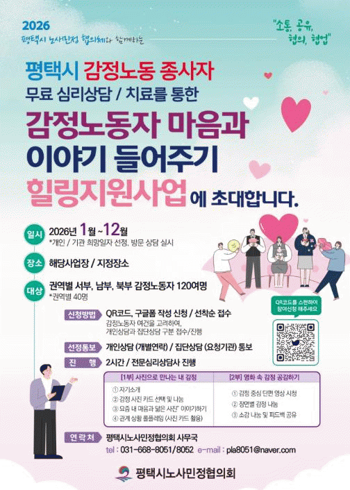 °¨Á¤³ëµ¿Àº °í°´ ÀÀ´ë °úÁ¤¿¡¼ ÀÚ½ÅÀÇ °¨Á¤À» Á¶ÀýÇÏ¸ç ¼ºñ½º¸¦ Á¦°øÇØ¾ß ÇÏ´Â ¾÷¹« Ư¼º»ó Áö¼ÓÀûÀÎ ½ºÆ®·¹½º¿Í ½É¸®Àû ºÎ´ã¿¡ ³ëÃâµÇ±â ½¬¿î ¸¸Å, ÆòÅýóë»ç¹ÎÁ¤ÇùÀÇȸ´Â °¨Á¤³ëµ¿ Á¾»çÀÚµéÀÇ ½É¸®Àû ¾ÈÁ¤À» Áö¿øÇϰíÀÚ À̹ø »ó´ã ÇÁ·Î±×·¥À» ¿î¿µÇß´Ù.