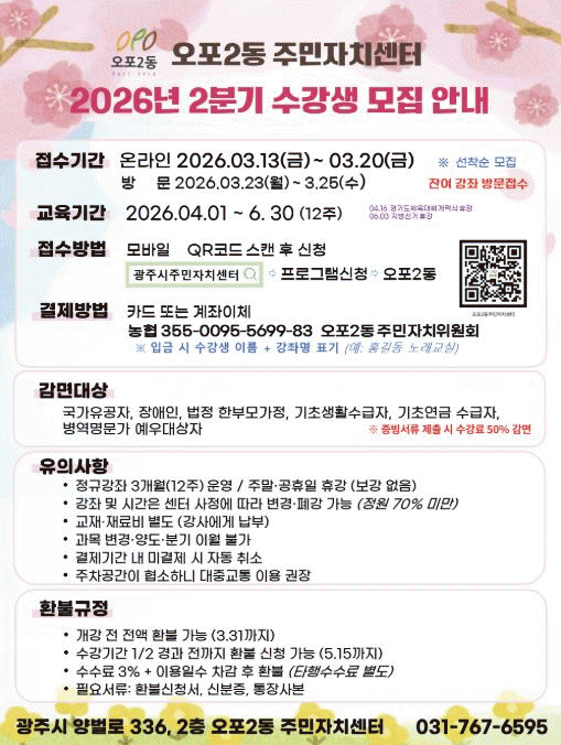 [NWS¹æ¼Û=Çѽ¸ñ ±âÀÚ]±¤Áֽà ¿ÀÆ÷2µ¿ ÁÖ¹ÎÀÚÄ¡¼¾ÅÍ´Â ¿À´Â 4¿ù 1ÀÏ °³°üÀ» ¾ÕµÎ°í 3¿ù 13ÀϺÎÅÍ 20ÀϱîÁö ¡®2026³â 2ºÐ±â ÁÖ¹ÎÀÚÄ¡ ÇÁ·Î±×·¥¡¯ ¼ö°»ý 924¸íÀ» ¼±Âø¼ø ¸ðÁýÇÑ´Ù.