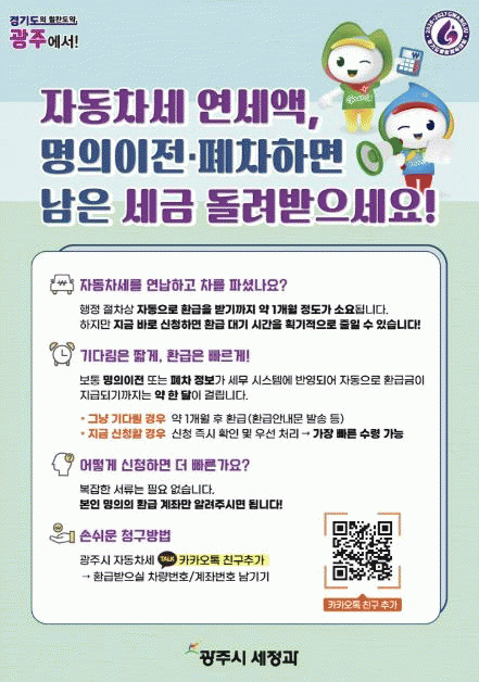 ½Åû ´ë»óÀº ÀÚµ¿Â÷¼¼¸¦ ¿¬³³ÇÑ µÚ Â÷·®À» ÀÌÀüÇϰųª ¸»¼ÒÇÑ ÀÚµ¿Â÷ ¼ÒÀ¯ÁÖ´Ù. ½Åû ¹æ¹ýÀº īī¿ÀÅå¿¡¼ ¡®±¤Áֽà ÀÚµ¿Â÷¼¼¡¯ ä³ÎÀ» Ä£±¸·Î Ãß°¡ÇÑ µÚ äÆÃâ¿¡ ȯ±Þ ´ë»ó Â÷·® ¹øÈ£¿Í º»ÀÎ ¸íÀÇ °èÁ¹øÈ£¸¦ ³²±â¸é µÈ´Ù.