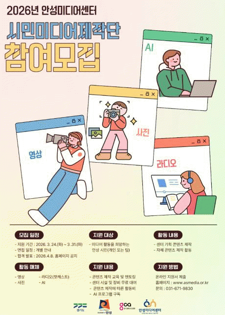 | ¾È¼º¹Ìµð¾î¼¾ÅÍ, 2026³â ½Ã¹Î¹Ìµð¾îÁ¦ÀÛ´Ü Âü¿© ¸ðÁý =Çѽ¸ñ ±âÀÚ |