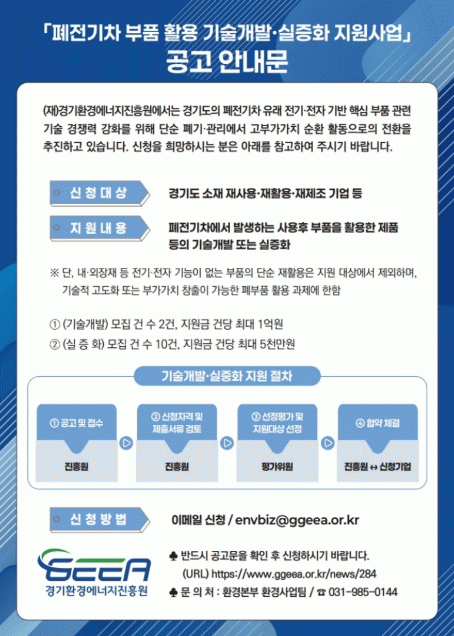 [NWS¹æ¼Û=Çѽ¸ñ ±âÀÚ]°æ±âȯ°æ¿¡³ÊÁöÁøÈï¿øÀº 4¿ù 7ÀϱîÁö ¡®2026³â ÆóÀü±âÂ÷ ºÎǰ Ȱ¿ë ±â¼ú°³¹ß ¹× ½ÇÁõÈ­ Áö¿ø»ç¾÷¡¯¿¡ Âü¿©ÇÒ ±â¾÷À» ¸ðÁýÇÑ´Ù.