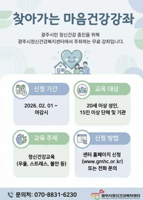 [NWS¹æ¼Û=Çѽ¸ñ ±âÀÚ]±¤ÁÖ½ÃÁ¤½Å°Ç°º¹Áö¼¾ÅÍ´Â Áö¿ª ³» ±â°ü ¹× ´Üü¸¦ ´ë»óÀ¸·Î Á¤½Å°Ç° ÀÎ½Ä Çâ»ó°ú Á¤½ÅÁúȯ ¿¹¹æÀ» À§ÇÑ ¡®2026³â ã¾Æ°¡´Â ¸¶À½ °Ç° °Á¡¯¸¦ ¿À´Â 11¿ù±îÁö ¿î¿µÇÑ´Ù°í 20ÀÏ ¹àÇû´Ù.