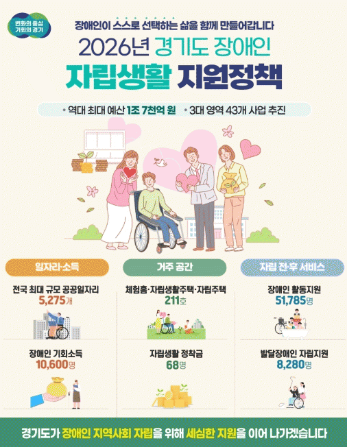 | °æ±âµµ, Àå¾ÖÀÎ ÀÚ¸³¿¡ ¿ª´ë ÃÖ´ë 1Á¶ 7õ¾ï ¿ø ÅõÀÔ¡¦ ÀÏÀÚ¸®¡¤ÁÖ°Å ÃÎÃÎÇÑ Áö¿ø 2026³â °æ±âµµ Àå¾ÖÀÎ ÀÚ¸³»ýȰ Áö¿ø ½ÃÇà°èȹ ¼ö¸³ ¹× »ç¾÷ ÃßÁø, 1Á¶ 7,749¾ï ¿ø ÅõÀÔ =Çѽ¸ñ ±âÀÚ |