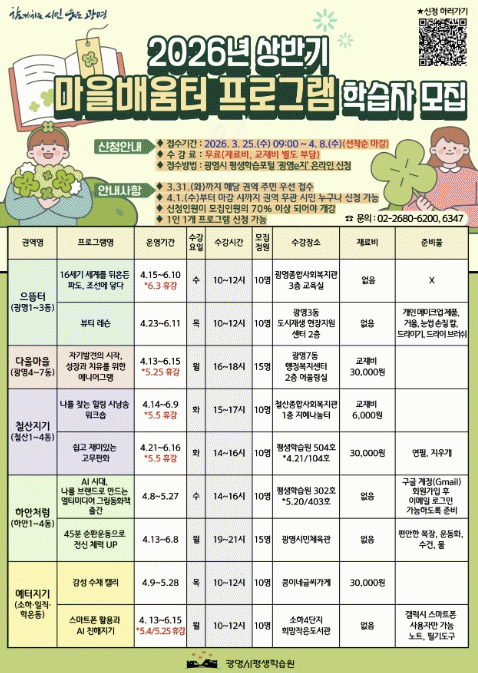 | ±¤¸í½Ã, '¸¶À»¹è¿òÅÍ'·Î ÀÏ»ó ¼Ó ÇнÀ±Ç ³ÐÈù´Ù 4¿ù 8ÀϱîÁö 5°³ ±Ç¿ª 9°³ ÇÁ·Î±×·¥ ¿î¿µ¡¦ Ãë¹Ì ³Ñ¾î ¡®¼ºÂû¡¯ Á᫐ ÁúÀû °È =Çѽ¸ñ ±âÀÚ |