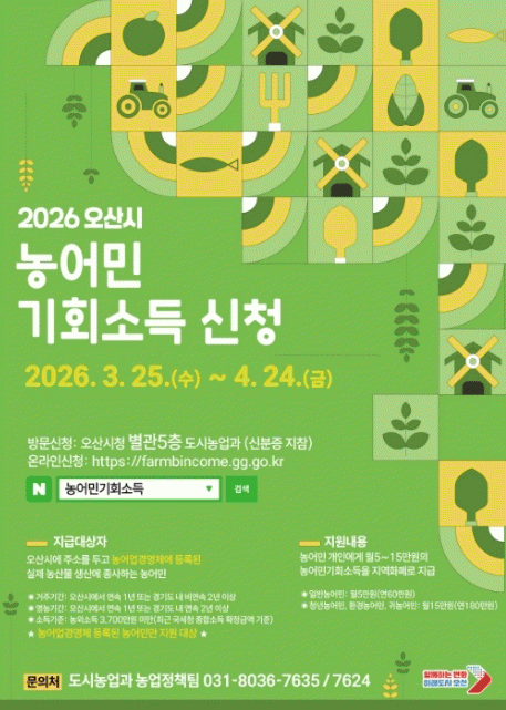 | ¿À»ê½Ã, '2026³â ³ó¾î¹Î ±âȸ¼Òµæ' ½Åû Á¢¼ö¡¦3¿ù 25ÀϺÎÅÍ 4¿ù 24ÀϱîÁö =Çѽ¸ñ ±âÀÚ |