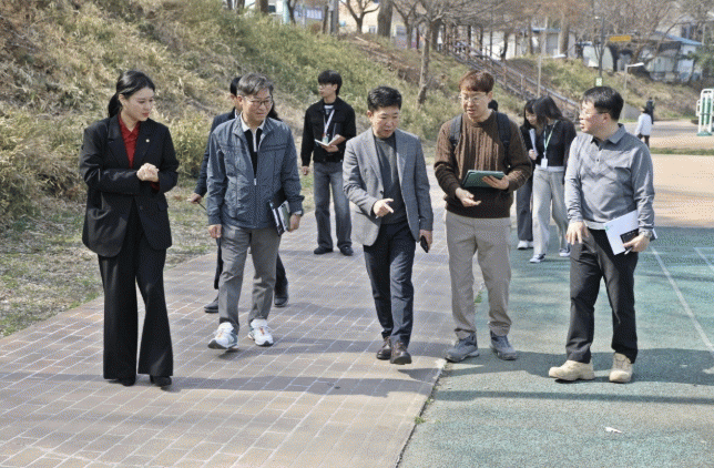 À̳¯ Âü¼®ÀÚµéÀº Á¤ºñ ¿¹Á¤ÀÎ ¼µÐ±³~Æò°í±³ ¾à 695m ±¸°£À» Á÷Á¢ °ÉÀ¸¸ç »êÃ¥·Î ¿©°Ç°ú ¾ß°£ Á¶¸í »óŸ¦ Á¡°ËÇÏ°í °³¼± ¹æÇâÀ» ³íÀÇÇß´Ù.