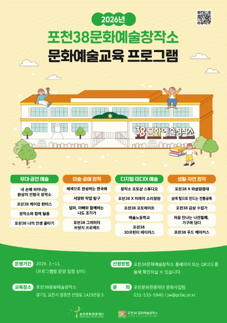 Æ÷õ38¹®È¿¹¼úâÀÛ¼Ò´Â ¾ÕÀ¸·Îµµ ´Ù¾çÇÑ ¹®È¿¹¼ú±³À°°ú Àü½Ã, °ø°£ ¿î¿µÀ» ÅëÇØ ½Ã¹Î°ú ´õ¿í °¡±îÀÌ È£ÈíÇÏ´Â Áö¿ª ¹®È¿¹¼ú°ø°£À¸·Î¼ÀÇ ¿ªÇÒÀ» À̾ °èȹÀÌ´Ù.