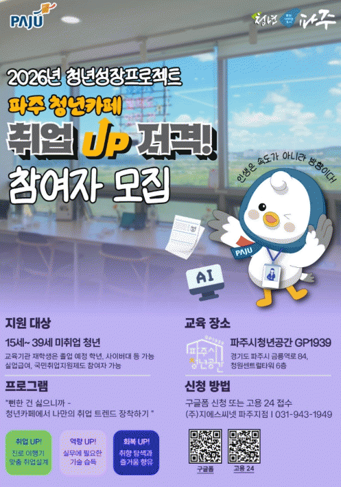 | ÆÄÁÖ½Ã, 2026³â û³â¼ºÀåÇÁ·ÎÁ§Æ®(û³âÄ«Æä) º»°Ý ¿î¿µ¡¦'Ãë¾÷(UP)Àú°Ý'1±â Âü¿©ÀÚ ¸ðÁý ¡°»·ÇÑ °Ç ½ÈÀ¸´Ï±ñ...¡±ÆÄÁÖ Ã»³âÄ«Æä¿¡¼ ³ª¸¸ÀÇ Ãë¾÷ Æ®·»µå ÀåÂøÇϱâ =Çѽ¸ñ ±âÀÚ |