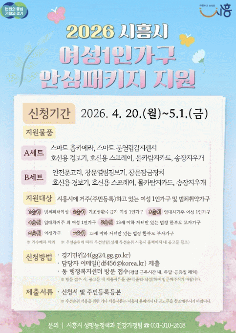 [NWS¹æ¼Û=Çѽ¸ñ ±âÀÚ]½ÃÈï½Ã´Â °ü³» ¿©¼º 1ÀÎ °¡±¸ µîÀÇ ¾ÈÀüÇÑ ÀÏ»ó º¸È£¸¦ À§ÇØ ¡®2026³â ½ÃÈï½Ã ¿©¼º 1ÀÎ °¡±¸ ¾È½ÉÆÐŰÁö Áö¿ø»ç¾÷¡¯À» ÃßÁøÇϰí, ¿À´Â 4¿ù 20ÀϺÎÅÍ 5¿ù 1ÀϱîÁö ½ÅûÀ» ¹Þ´Â´Ù.
