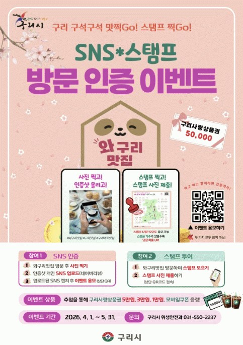 | ±¸¸®½Ã, ¸ÀÁý ã¾Æ ¶°³ª´Â '¿Í±¸¸®¸ÀÁý ¹æ¹® ÀÎÁõ Çà»ç' ¿î¿µ »çȸ°ü°è¸Á ¼ºñ½º(SNS) ÀÎÁõ¡¤µµÀå Âï±â ¿©Çà(½ºÅÆÇÁ Åõ¾î)¡¦ ½Ã¹Î Âü¿©Çü È«º¸ È®´ë =Çѽ¸ñ ±âÀÚ |