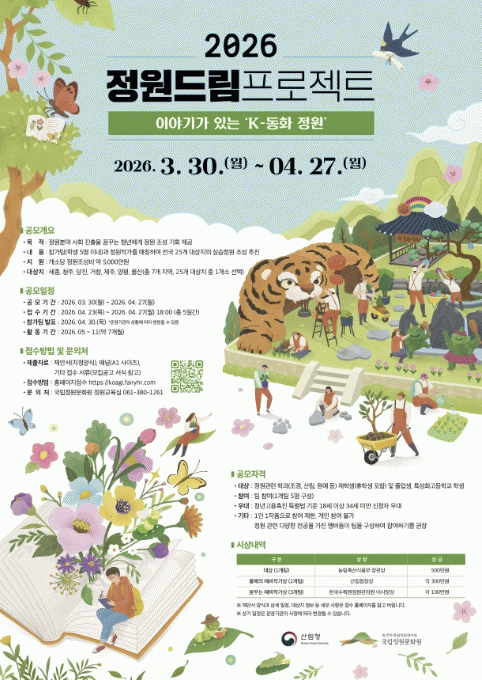 ¡®2026 Á¤¿øµå¸²ÇÁ·ÎÁ§Æ®¡¯´Â û³â Á¤¿ø ÀÎÀ縦 ¹ß±¼ÇÏ°í ½Ç½À Áß½ÉÀÇ Á¤¿ø Á¶¼º ±âȸ¸¦ Á¦°øÇÏ´Â ÇÁ·Î±×·¥ÀÌ´Ù. Èñ¸ÁÀÚ´Â ÆÀ ´ÜÀ§·Î Áö¿øÇÒ ¼ö ÀÖÀ¸¸ç, ¼±¹ßµÈ ÆÀ¿¡´Â ¾à 5,000¸¸ ¿øÀÇ Á¤¿ø Á¶¼ººñ°¡ Áö¿øµÈ´Ù. °ø¸ð´Â 3¿ù 30ÀϺÎÅÍ 4¿ù 27ÀϱîÁö ÁøÇàµÇ¸ç, Á¢¼ö´Â 4¿ù 23ÀϺÎÅÍ 4¿ù 27ÀϱîÁö ±¹¸³Á¤¿ø¹®È¿øÀ» ÅëÇØ ÀÌ·ç¾îÁø´Ù.