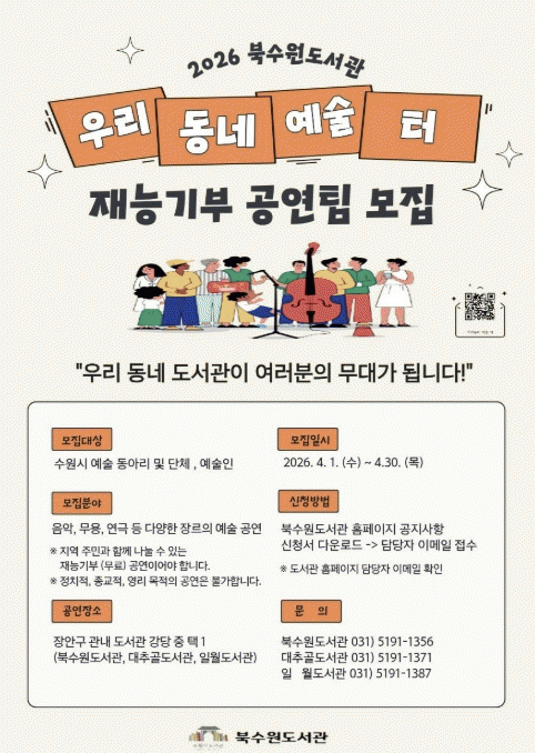 | ºÏ¼ö¿ø¡¤´ëÃß°ñ¡¤ÀÏ¿ùµµ¼°ü, '¿ì¸®µ¿³× ¿¹¼ú ÅÍ' Àç´É±âºÎ °ø¿¬ÆÀ ¸ðÁý 4¿ù 30ÀϱîÁö ¸ðÁý¡¦ µµ¼°ü ¹«´ë¼ À½¾Ç¡¤¹«¿ë¡¤¿¬±Ø µî °ø¿¬ ±âȸ Á¦°ø =Çѽ¸ñ ±âÀÚ |