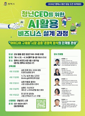 Âü°¡ ´ë»óÀº ÆòÅýà °ü³»¿¡¼ â¾÷¿¡ °ü½ÉÀÌ ÀÖ´Â ¸¸ 19¼¼ºÎÅÍ 39¼¼±îÁöÀÇ Ã»³âÀ̸ç, ½Åû ±â°£Àº 4¿ù 2ÀϺÎÅÍ 17ÀϱîÁö ¾È³» À̹ÌÁöÀÇ Á¤º¸¹«´Ì(QRÄÚµå)¸¦ ÅëÇØ Á¢¼öÇÒ ¼ö ÀÖ´Ù. À̹ø ±³À° °Á¿¡ ´ëÇÑ ÀÚ¼¼ÇÑ ¹®ÀÇ´Â ÆòÅýÃû û³âÁ¤Ã¥°ú(031-8024-3571)·Î ÇÏ¸é µÈ´Ù.