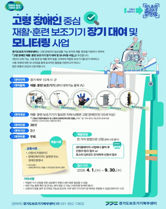 [NWS¹æ¼Û=Çѽ¸ñ ±âÀÚ]°æ±âµµ¿Í °æ±âµµÀçȰ°øÇм­ºñ½º¿¬±¸Áö¿ø¼¾ÅͰ¡ °í·É Àå¾ÖÀÎÀÇ ½Åü ±â´É À¯Áö¿Í ÀÚ¸³À» µ½±â À§ÇÑ º¸Á¶±â±â¸¦ ÃÖ´ë 2³â°£ ¹«·á·Î ´ë¿©ÇÏ´Â ¡®°í·É Àå¾ÖÀÎ ÀçȰ¡¤ÈÆ·Ã º¸Á¶±â±â Àå±â ´ë¿© ¹× ¸ð´ÏÅ͸µ »ç¾÷¡¯À» ÃßÁøÇÑ´Ù.