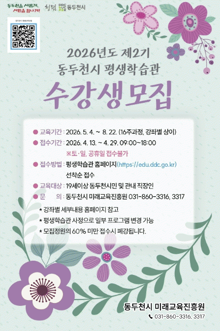[NWS¹æ¼Û=Çѽ¸ñ ±âÀÚ]µ¿µÎõ½Ã´Â ½Ã¹ÎÀÇ Æò»ýÇнÀ ±âȸ È®´ë¸¦ À§ÇØ 2026³â Æò»ýÇнÀ°ü Á¦2±â Á¤±Ô ÇÁ·Î±×·¥ ¹× 5¿ù Ư°­ ÇÁ·Î±×·¥ ¼ö°­»ýÀ» ¸ðÁýÇÑ´Ù°í ¹àÇû´Ù.