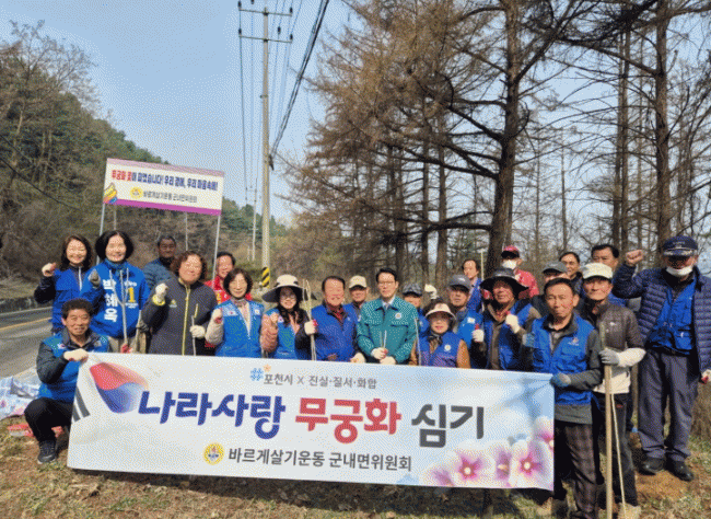 À̳¯ Çà»ç¿¡´Â ¹Ù¸£°Ô»ì±â¿îµ¿ ±º³»¸éÀ§¿øÈ¸¿Í Æ÷õ½ÃÇùÀÇȸ ȸ¿ø µî 30¿© ¸íÀÌ Âü¿©Çß´Ù. Âü¼®ÀÚµéÀº Á÷µÎ¸® ÀÏ¿ø¿¡ ¹«±ÃÈ­ 200ÁÖ¸¦ ½ÉÀ¸¸ç ³ª¶ó²ÉÀÎ ¹«±ÃÈ­ÀÇ Àǹ̸¦ µÇ»õ±â°í, Áö¿ª ÁÖ¹ÎÀÇ ¾Ö±¹½É°ú °øµ¿Ã¼ ÀǽÄÀ» ³ôÀÌ´Â ¶æ±íÀº ½Ã°£À» °¡Á³´Ù. ¶ÇÇÑ Á÷Á¢ ½ÄÀç Ȱµ¿¿¡ Âü¿©ÇÏ¸ç ³ª¶ó²ÉÀÇ »ó¡¼º°ú ¼ÒÁßÇÔÀ» ÇÔ²² µÇ»õ°å´Ù.