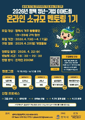 [NWS¹æ¼Û=ÇãÀº¼ ±âÀÚ]ÆòÅýô ±â¾÷ ÇöÁ÷ÀÚµéÀÇ Ãë¾÷ ¸àÅ丵À» ÅëÇØ ½ÇÁúÀûÀÎ Ãë¾÷ Áغñ¸¦ Áö¿øÇϰí ÀÎÀû ³×Æ®¿öÅ© Çü¼º ±âȸ¸¦ Á¦°øÇϱâ À§ÇÑ ÆòÅà û³â-±â¾÷ À̾îµå¸² ¡®¿Â¶óÀÎ ¼Ò±Ô¸ð ¸àÅ丵 1±â¡¯ Âü¿©ÀÚ¸¦ ¿À´Â 4¿ù17ÀϱîÁö ¸ðÁýÇÑ´Ù.