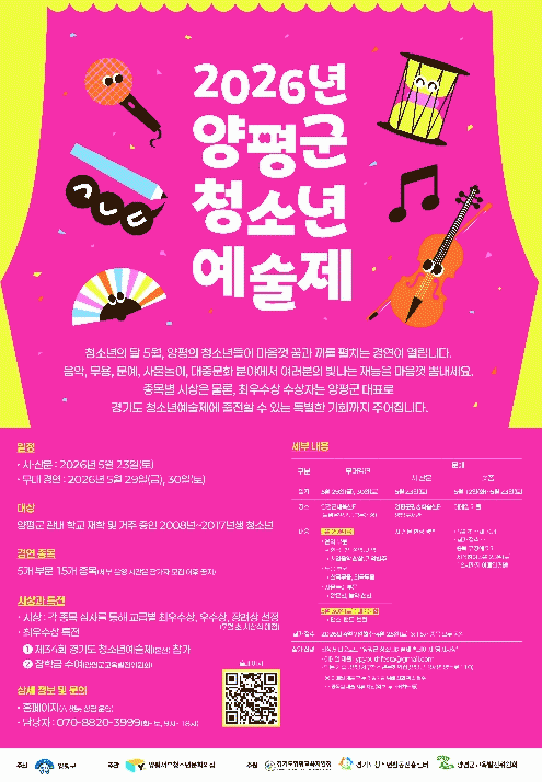 ¹®¿¹ ºÎ¹® ½Ã¡¤»ê¹® ÇöÀå °æ¿¬Àº 5¿ù 23ÀÏ ¾çÆò±ºÆò»ýÇнÀ¼¾ÅÍ¿Í ¾çÆòµµ¼­°ü¿¡¼­ °³ÃֵȴÙ. ¹«´ë °æ¿¬Àº À½¾Ç¡¤¹«¿ë¡¤»ç¹°³îÀÌ ºÎ¹®ÀÌ 5¿ù 29ÀÏ, ´ëÁß¹®È­ ºÎ¹®Àº 5¿ù 30ÀÏ ¾çÆò±ºÃ¼À°¼¾ÅÍ ´Ù¸ñÀûüÀ°°ü¿¡¼­ °¢°¢ ÁøÇàµÈ´Ù. ¼ôÆû Á¾¸ñÀº 5¿ù 12ÀϺÎÅÍ 23ÀϱîÁö ÀüÀÚ¿ìÆíÀ¸·Î ÀÛǰÀ» Á¢¼öÇÑ µÚ ½É»ç¸¦ °ÅÃÄ ¼±Á¤µÈ´Ù.