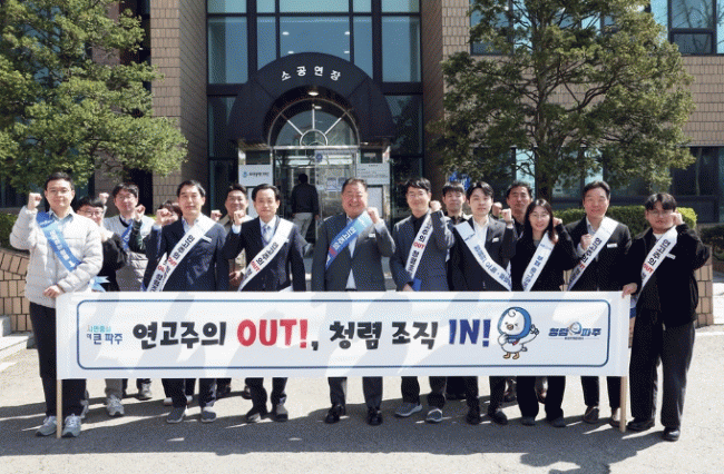[NWS¹æ¼Û=Çѽ¸ñ ±âÀÚ]ÆÄÁֽô °øÁ÷»çȸÀÇ ½Å·Ú¸¦ ȸº¹Çϰí Á¶Á÷ Àü¹ÝÀÇ Ã»·Å ÀνÄÀ» Á¦°íÇϱâ À§ÇØ 8ÀÏ ½Ã¹Îȸ°ü ¼Ò°ø¿¬Àå ¾Õ¿¡¼ 2026³â ¡®¿¬°íÁÖÀÇ ±ÙÀý¡¯Ã»·Å È«º¸È°µ¿À» ½Ç½ÃÇß´Ù.